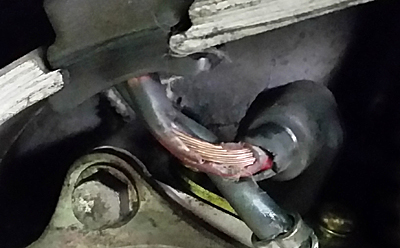 そんな中 配線被服が一部 剥がれてしまっているところ発見。とは言いながら、この不具合は今回が原因ではない模様。この車両、以前に ウェイトローラ粉砕も経験しているらしく その破片が飛び回った形跡も多々ありました。