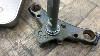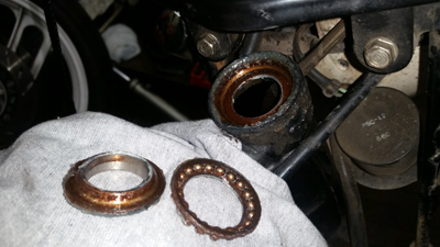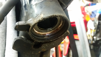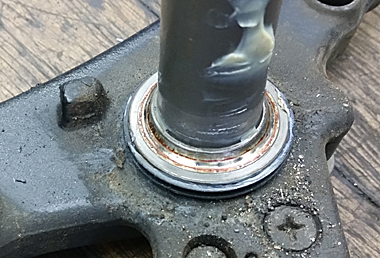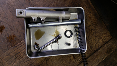 摺動部を見てみても致命的なサビや傷等はなかったので 放置により数年作動してなかったことでシールにオイル分が潤滑していなくて 劣化により漏れてきたと推測です。因みに フォークに限らず シール類やガスケット類は 車両使用が煩雑な方の車両ほど 距離を乗ってきても 漏れないものが多いです。フォークオイルがシールを潤滑しているというのもありますしそれでいて定期的に動かすことで作動熱でシールに熱も入るので それによりゴム質の中にオイル分がまわるというのもあるからでしょう。