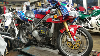 この車両 2000年式ですので まだメカメカしい トップフィード型のインジェクターですね。いつみても 「カッコイイ」とtetsuは思ってしまう。ピカピカなファンネル&スロットルボディは既に十分 大口径です。因みに 2000年までの上位機種の996SPSは この部分のインジェクターが「ツーインジェクター」となっており 2段構えのタワー型装着となっており それはそちらで見るだけでカッコイイんですよ(笑)。2001年~は996R,748R共 更に大口径スロットルボディ&シャワータイプのインジェクターと進化していきます。