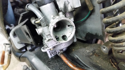 写真でも分かりますが、比較的真新しい クリーナー、しかもしっかり純正ぽいです。おやおや ということはキャブがなにかダメ?とか思いつつ エアクリーナーを取り外して 原因判明。