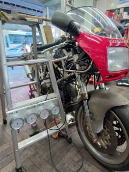 完成してキャブ装着後の バキュームゲージにて同調調整も久しぶりですね。