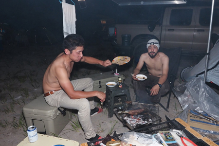 S部長と渡くんは野営派なので このままパドックに泊まります。他部員が 宿に出ようという時間には(18時前頃) 既に火を起こして カツオを焼いてました。