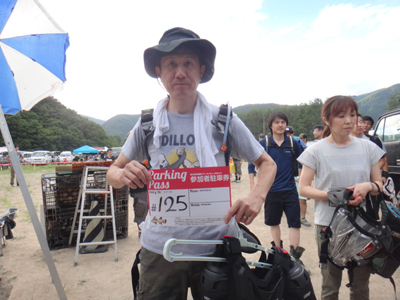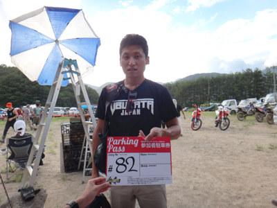 手に持っているのは駐車券です。このカードがないとパドック内には停められません。