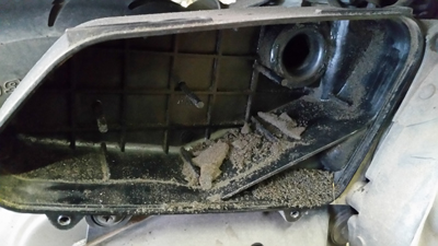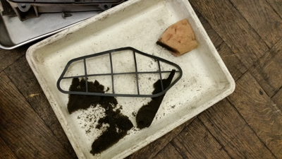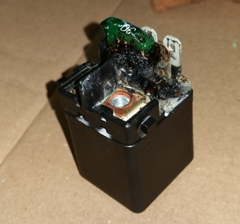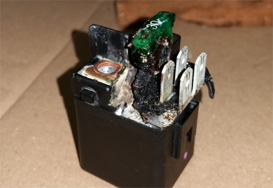 外したスターターリレー。30Aのヒューズ部分が溶けて一体化してます。