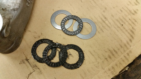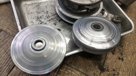 そして案の定、バラしてみて ドライブ側のプーリー表面は段付きもヒドく、 プーリーボス(クランクシャフトに嵌る部分)も径が大きくなってしまっていてガタガタ。ドリブン側のプーリーも作動出来なくなっている状態だったので 切れる前は変速もできない 「一対一」駆動(エンジン回転数分しか走れない状態)だったと推測されます。