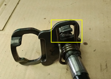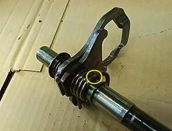 正常な状態は 黄色印内の スプリングの左右の部分が 真ん中のシフトシャフトの受けに接触していないとダメなんです。