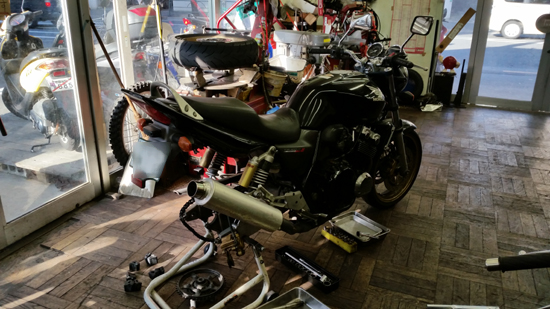 そんな途中で フジくんDRZ400に問題発覚!リヤキャリアの土台(基礎)の溶接部から割れてしまって 左右の留めてるボルトのみでの固定になってしまっていたっていう。