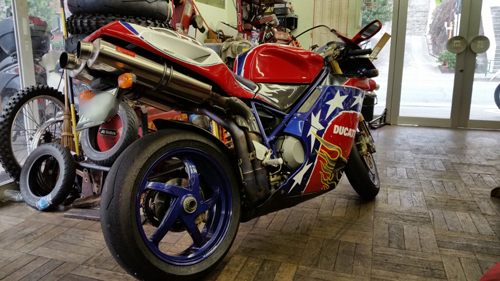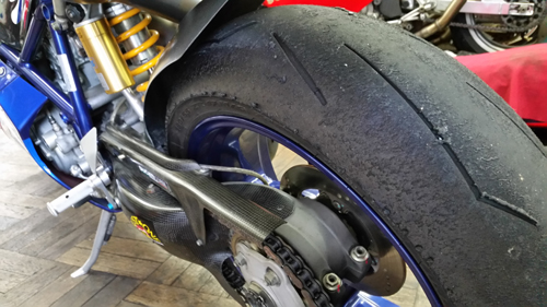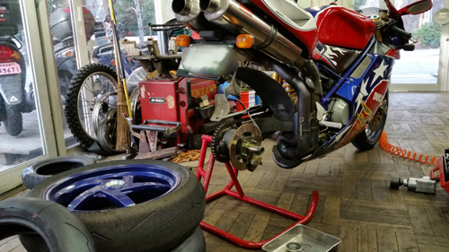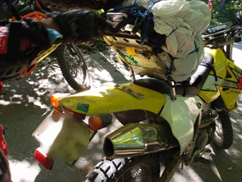 バッタンバッタンしなければいいので ひとまずフジくん得意のバンデージテープにてリヤフェンダーとグルグル巻きにして固定。これで気を付けていれば 道中帰りまではOKでしょう。実際この後に確認しても全く問題ありませんでした。