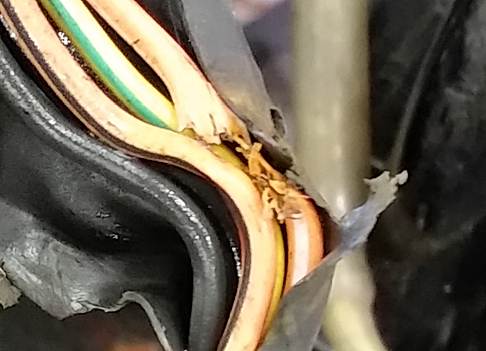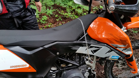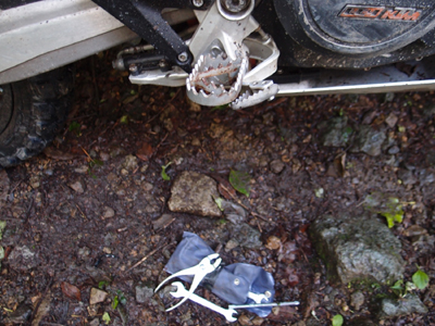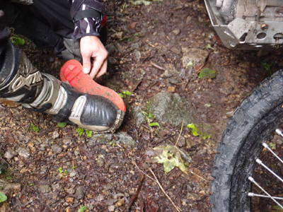 ほぼ真後ろに向いてしまってますね。690EDRのブレーキペダルはアルミ製なので過度な力を加えると折れます。ですので 完璧には戻せませんが このままではリヤブレーキが利いた状態なので まずはそれを解除しないわけには先に行けません。最悪 リヤブレーキなしで残りの2日間を走るようです。手持ちの工具を駆使して 意を決して 一発曲げ(途中で止めない)で進行方向側に曲がりを戻すことに成功しました。全体が屈曲して曲がっていたので 踏み込みの長さが短くなってしまいましたが これでなんとか走れますし、リヤブレーキも利かそうとすれば踏める状態に戻せました。剥がれたブーツのソールは今までも3回ほど剥がれてますので これは対応簡単です。こちらもビニテでグルグル巻きにて ひとまず走行OKです。