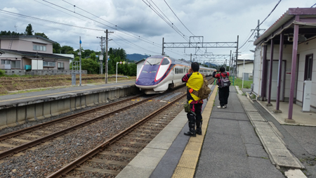 なんと 間違いなく 山形新幹線が走ってまいりました。 我々 部員は電車マニアでないのに 揃って 山形新幹線を写真撮るって言う図。 新幹線に乗っている人からしたら オフロードの恰好した変な3人組が 物珍しそうに 新幹線を写真撮っているという変な光景だったでしょう。