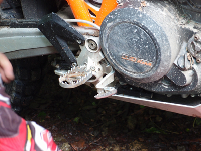 比較的荒れた路面のつづら折れを軽快スピードで走行中にUターン気味の立ち上がりで 拳大の石に後輪がヒットしてそのまま跳ね上がって 右に転倒横倒しになりながら滑走。その後 自力でバイクを起こそうとしたら なぜか右足が抜けません。後ろ走っていたササくんが起こしてくれようとしますが なぜか起こすのに連動して右足が引っ張り上げられます。よく見ると ブレーキペダルに右足のブーツのソール挟まっている(食い込んでいる?)状態に。四苦八苦しながら なんとか ブーツを引き抜いて 起こすことができました。外傷は ほぼないですが、ブレーキペダルが悲惨な事に.....