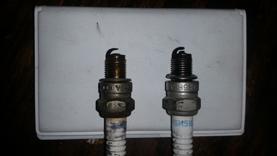 プラグの電極がほぼなくなっておりました(汗)。左が着いていたもの。右が3000kmほど使用のプラグ。このプラグ、3万キロ以上は使っていますね.......