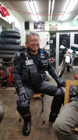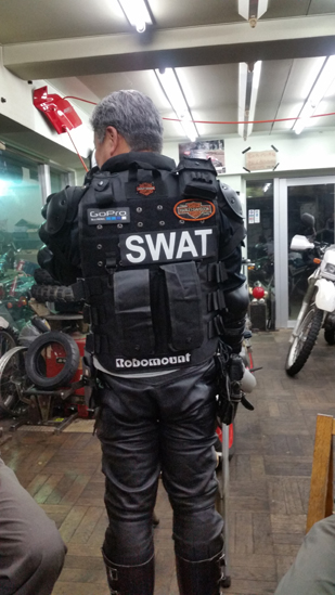 SWAT参上?! 全車皆兄弟 2018年10月06日 伊東二輪で知る人ぞ知る、GoProコスプレオヤジがまた こんな格好で参上しました(笑)。 今の時期は この『SWAT』だそうです(謎) SWATで爆音で暴走です(爆) 寒くなったら 『マッドマックス』だそうです。 その時周りにいた人間の意見では、「肩部分にハートの形のかたびら」「拳から鉄の針状のクギ」「ブーツに羽の形をしたナイフ(風)」「ヘルメットのアゴ部分はアメフトのようなガード」にして バイクにチェーンと鞭、ハンドルにモデルガンの機関銃を装着してほしいと 提案しておきました。 そこまでやって どこまで パンダさん達に職務質問されずに済むか 検証してほしいです!(爆)
