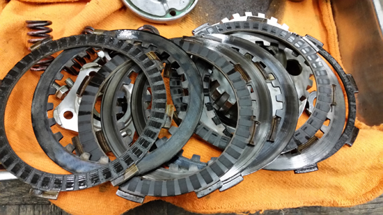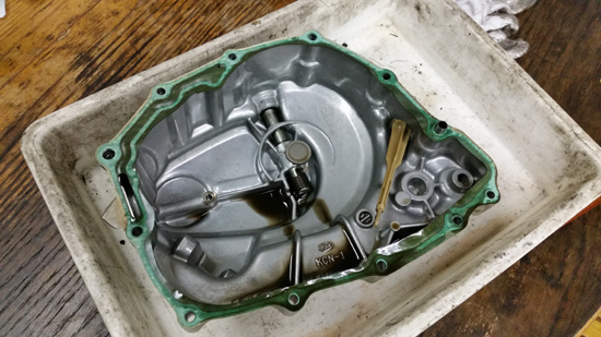 オイルを抜き クラッチカバーを開け.....で、意外にも クラッチ焼損になった時にオイルが劣化して焼けた臭いがするものですが それほどでもなく.....乗れるライダーさんが バンバンクラッチ使いまくり負担にして乗っている車体はクラッチカバーの内側もスラッジで汚いものですが 写真の通り全くキレイで.....後で聞きましたが、オイル交換はマメにやっていたそうなのでそれが良かったです。