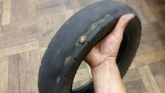 タイヤ使い過ぎもそうですがカーカスに穴が開いた部分が通常のセンター寄りでない珍しいパターン....