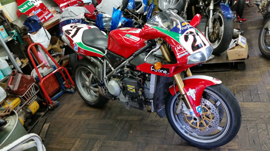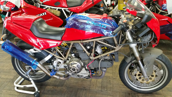 で、こちらは 伊東二輪 タンブリーニ車勢の一角、998Sベイリスくん。数少ないまっとうなオリジナルスタンダード車です。こちらはまだ23000kmですが、前オーナー時に オーバーヒートさせての「水タンク割れる」の刑に会っておりますが それ依頼は走り方も心得ており 現在は快調。今回の車検にて特に問題のある交換部品はありませんでした。