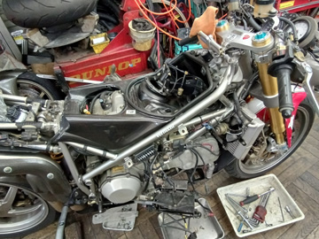 交換が無くても998の場合 タイミングベルト調整自体でもほぼ同じ姿までしないとリヤ側のタイベルが見えないので 作業はいつも まぁまぁ大変なんです。