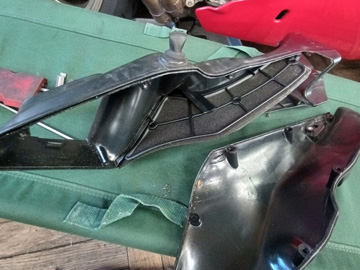 で、その際 ついでに エアクリーナーエレメントの状態を確認するのですが 998のエアクリーナーエレメントはこの左右のエアインレットダクト内にあります。
