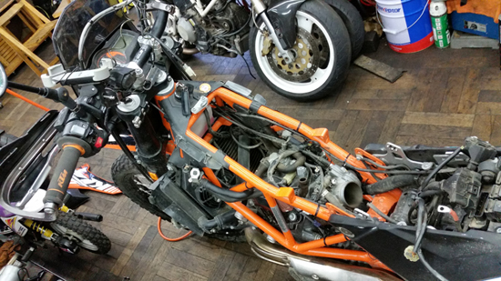 タイヤ、タイヤ、タイヤ!! 全車皆兄弟 2018年08月07日 ① M821の前後タイヤ交換 ②690EDの前後タイヤ交換 ③この間に飛び込みの V125タイヤ交換 ④DRZ400Sの前後タイヤ交換 ⑤できれば tetsuの 690EDRの前後タイヤ交換 ④まではお客様のなので頑張って閉店後までかかってやりましたが 自分のとなると流石に 飽きて(力もなくなりお腹も減り....) 断念 何気に タイヤ交換 時間かかるし、体力も使うんですよ~