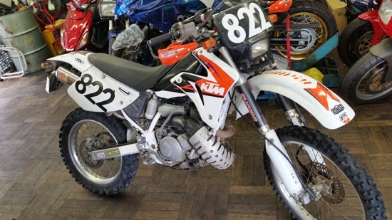 デカールは昨年暮れに貼った 2016年 KTM250SXのものです。ただの酔狂です(笑)。ササくんが殺風景なシェラウド周りを賑やかにしたいっていうことから相談を受け 当初 普通にCRM用と思ったのですが それじゃ面白くないので この仕様になりました(笑)。愛嬌ってもので(笑)。半分以上 tetsuの勧めと趣味で 貼るときもサポート(いや、ほとんど)して 貼り方指南とかしつつ 楽しく、熱く(笑) ステッカーチューンしたものでした。どこぞの エンデューロ会場でも 知らない人がわざわざ見に来て「なんだ!ホンダかよ!!」って言っていたそうです(苦笑)。ちょっと遠目から見ると 謎の旧いKTM車両とも思えますが、ちゃんとオフ車が判るひとなら エンジンケース周り(特に右側)見れば 一目 CRMとわかりますので。ゼッケンは前回出たレースのままですね。