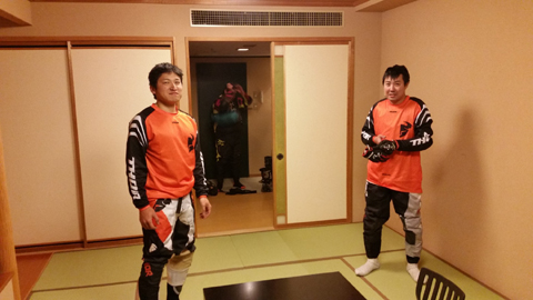 ↓ 部屋でツーショットの ミヤくん&ササくん 「KTMオレンジブラザーズ」って感じですが なぜか示し合わせたわけではないのに同じ Thor のジャージ(驚)。君たち デキてる?(笑)