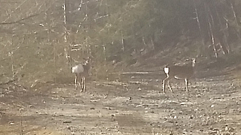 しばらく休憩後、下山します。滅多に下らない(いつも抜けていってしまうので)ガレ路面を堪能しつつ ある程度下山したところで 後続を待ちます。yojiくんと待っている際に 向かう方向に 鹿が二頭出現しました。二頭ともお尻が白いので若い鹿ですか。この時の時間が5時にさしかかるところだったので 鹿が一番出没しやすい時間でもありました。余談ですが この日は昼間から合わして 計 5頭の鹿に遭遇しました。ぶつかりたくないものです(汗).....tetsuの知り合いの知り合いは鹿とぶつかり バイクは大破、人間 病院送りになってますので.....(汗汗)