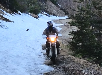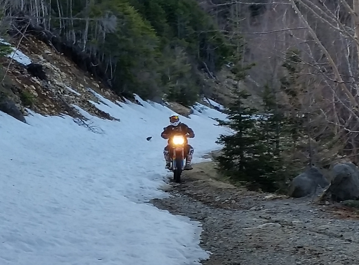残り 1キロ強くらいは こんな感じで 道全体が雪に覆われていて ガケ側 のみ溶けて路面が見えてる程度。場所によってはそこまでも雪が残っているところもあり その箇所に突入したのは先頭 tetsuが最初だったので(先人の形跡はありませんでした)。