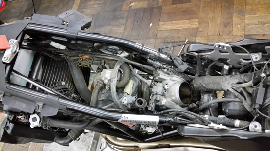ということでシート外して シート下のバッテリーやら配線類を外して 、エアクリBOX外して ヘッドカバー登場。因みに フレーム前部に燃料タンクはありません。当該車両は燃料タンクはシートの後ろ(っていうかシートフレーム自体が燃料タンク)なのですね。