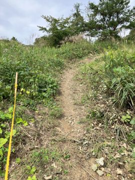 数十メートル下った先の小山を乗り越えて出現したのが 山の木々を抜け切れる 30mほどのV字谷気味の直登クライム(汗)。