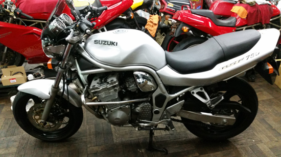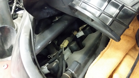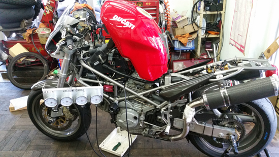 それと少し調整も......レーサーなのでアイドリングはそれほど重要ではありませんが 始動後に結構アイドリングが不安定で 落ち込むことがある.....とのことで ついでいに前後気筒のスロットルバランスを見て診ます。インジェクションでもスロットルボディのバタフライバルブ部の汚れ等で吸気バランスが変わる事があります。とはいえ 通常アイドリング用の流路はインジェクションの場合別流路になるのですが その部分が汚れていてもなりますね。