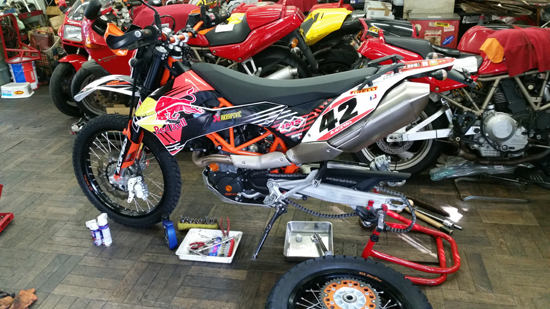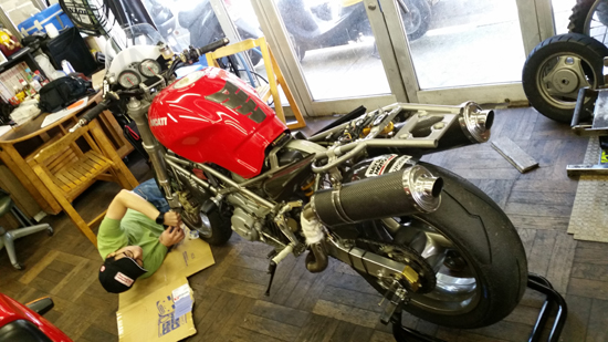 レースで義務づけられている各部のワイヤリング(重要箇所の締め付け確認及び緩み止め)を本人が施工しているところです。伊東二輪は レースサポートもしますが 基本的に「自分でできるところは自分でやりなさい!!」派なので 本人も試行錯誤しながらも頑張ってやってました(笑)
