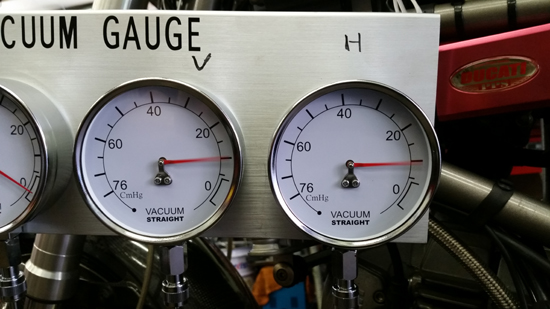 バキュームゲージを装着してエンジン始動。冷間時からある程度暖気までのバランスも変化量も少なく いい感じですね。