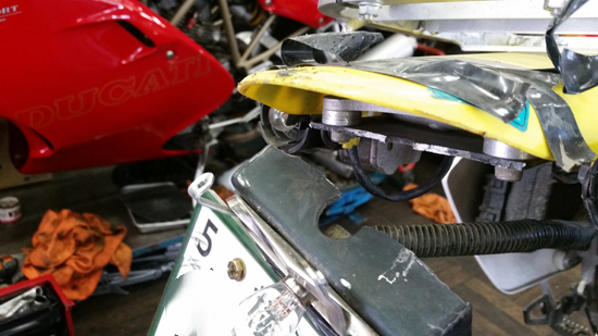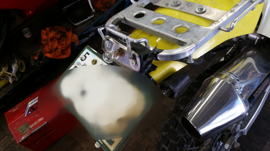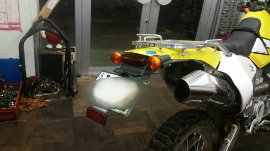DRZ400S テールランプ改造修理 全車皆兄弟 2017年06月11日 先週の林道中にてテールランプ周り破損により 現場簡易修復で帰没した スズキ DRZ400Sさんのテールランプ周り修理です。写真のように バッキリ折れてますね。 やはり林道対策とした場合は ノーマル戻しがある程度 一定の安心感はあります。しかしお客様の意向で 「かっこいいのがいい」ということ。 そうなると選択肢は よくあるDRZ用のLEDテールランプキット等。先週壊れた仕様は中古購入時から装着されていた 社外DRZ用フェンダーレステールランプキットでしたが、その装着のされ方の検証から 林道行くDRZなら 樹脂製の汎用キットの方がいいだろうということで 今回は DRCのアナトEDリヤフェンダーにしました。 エンデューロレーサー等に装着する用の軽量小型でLEDテールランプ装備のフェンダーです。 汎用ですので勿論 ボルトオンにてサササとは付きませんね。DRZ400はシートレールがお金がかかっているアルミ製で シート末端もあまり多くのボルト止めは出来ない構造+平ではないので 試行錯誤しました。 シートレールに 2点止めで 上から乗せる形で止めて、補強で一枚板を上に当てます。でこの上に ノーマルの黄色のフェンダー部を載せて リヤキャリア装着という図式にしました。 ナンバーホルダーもフェンダーキットに入って来た物は 樹脂製だったのでそれは粉砕必至ですので 却下、今回取り外した壊れたテール周りのナンバー台座部分だけ切り取って 再使用することにしました。そこそこ厚いアルミ金属製でそれを直接 汎用フェンダーに装着しましたので かなり強度はOKでしょう。 ノーマルウィンカーも フェンダー側に穴を開けて 装着。LEDナンバー灯もナンバーと共締めタイプで 取り付けてこんな感じで仕上がりました。こういう改造で大事な保安基準も完璧です。 戦闘的スタイルで お客様も満足な出来栄えでした。また元気に林道行きましょう。