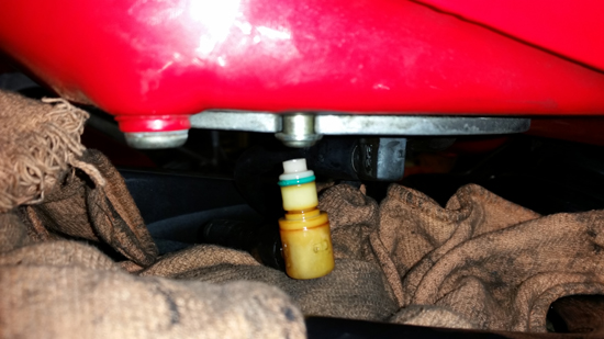 早速シートカウル外して燃料タンクを持ち上げてリヤバンクのヘッドの上にウェスを敷いて キーオン。燃料ポンプの作動音と共に 結構な勢いで燃料が漏れてます。