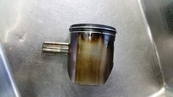 で、今回の取り外したピストン 側面に燃焼吹き抜けの跡が沢山付いてますね。特にリング部下部周辺の黒い部分が全部そうです。上部の燃焼がリングとシリンダー壁をすり抜けてスカート側に抜けているのですが 一番の理由は使用距離による経年のピストンリングのへたりなのですが、今回のケースは別の事も起こっていました。