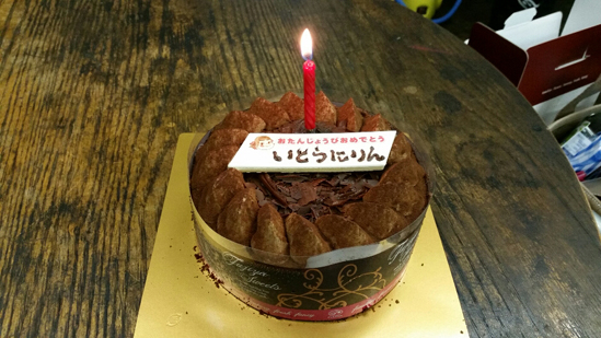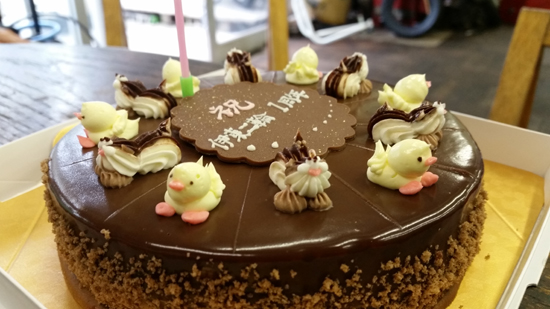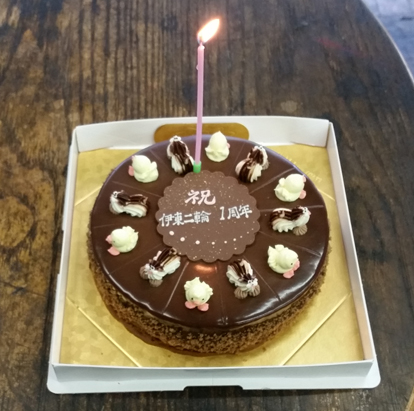 先日、またまた一周年バースデイケーキを頂いてしましました~。 伊東二輪には似つかわしくもないまたもこんな可愛らしい! しかもまたも大好きな チョコレートケーキです。