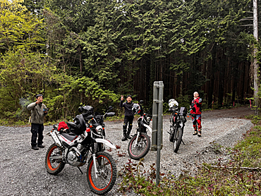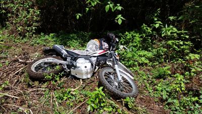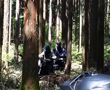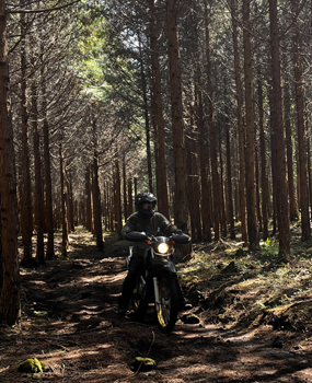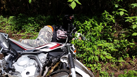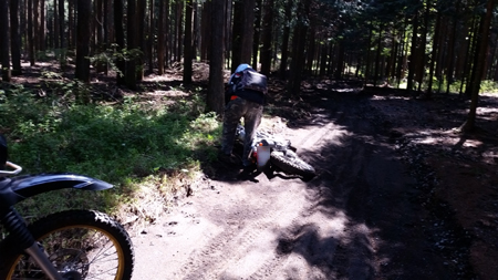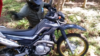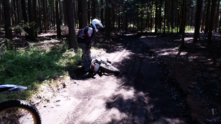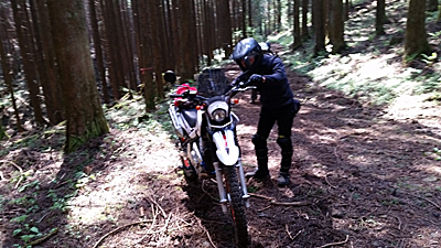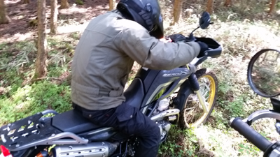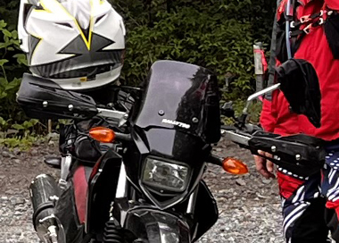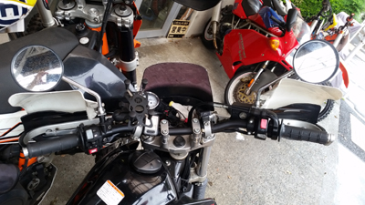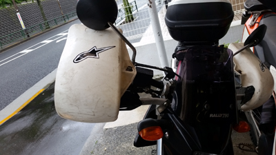 それまでは ストーンガードと言って アルミでハンドルエンドからレバー全部を囲っているフレームがない 純正オプションのいわゆる『オープンエンド』型 でしたが 今回は林道ということもあるのと 現在もまだ継続中ですが 右手の薬指を負傷しているのを守るべくというのもあり 急遽 『クローズドエンド』のハンドガードを装着したわけで。