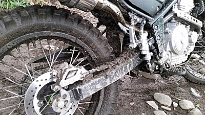 写真はスイングアーム下部の写真ですが チェーンとスイングアームの間にあるべき 白いチェーンスライダーがありませんねぇ。
