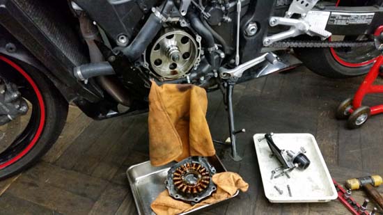 調べていくと、どうも 「ステータ」に問題があるようです。ステータとはメーカで呼び名も変わりますが、「ACジェネレータ」なんて言われたりしてもいます。簡単に言うと、「発電機」です。この発電機が発電できなくなっているようですね。この部分はあらゆるバイク、壊れる時は壊れてしまいます。予防もできません.....