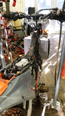 KTM 150EXC TPI 諸整備 全車皆兄弟 2023年03月05日 伊東二輪林道部 H川さんの オフ遊び車両 KTM150EXC TPI の 定期整備依頼です。 モデルイヤー 2021で購入後 約1年半以上 乗りっぱなしでしたのでここらで全体 点検がてら各部グリスアップと 使用時間による必要部品等交換します。 当該車両、レースにはほぼ出てないのですが お山ヒルクライム系のハード目なお遊びが好きなオーナーなので 車体は距離、使用時間のわりにヤレてます(悲)。 まずは 部品交換から。 オイルインジェクター交換します。メーカー推奨 稼働時間 80時間ですが 車体アワーメーター上 73時間ですので若干早めですが 早いに越したことはないので このタイミングで交換します。 黄色丸印辺り奥辺りにオイルタンクがありますがその下に装着されております。 タンクやチャンバーが邪魔なので外して行きます。 とここでチャンバー外しにかかって 危ういもの発見。 チャンバーが妙に斜めって装着されてますね..... H川さん 車体持ってくる当日に 日野カン(日野カントリーオフロードランドの略)にて練習の帰りと言っていたので 練習中に結構な勢いで右に車体ぶん投げたのか..... それにしても随分とずれてしまっていると思い ふと裏側見ると 汗汗でした。 チャンバー本体が裏側通っている ラジエターホースをフレームとの間に思いっきり潰してました(汗汗)。 チャンバー外してみたらホースの接触部も昨日今日ついた跡ではない模様...... 以前 Sinくんが同様になっていたままtetsuも気が付かず整備に入り、クーラント入れ替えた瞬間にホースに穴が空いたっていう経緯がありましたので これはヤバイですね。 ホースは予定外でしたが 見逃せないので別途 新品発注して交換ですね。 ということでそこは最後でも出来るので出来る作業を先に全部やっちゃいます。 新品オイルインジェクター。何気にミクニ製でしたね。 要は 昔の2ストトレール車で言う オイルポンプと同じ役割をしてます。 燃料インジェクターと同じような原理ですが オイルが出なくなると致命的な2ストとしては定期交換部品に指定されているのも納得します。 以前に 林道部 Sinくんのと 林道部外の250EXCTPIで交換しているので今回でtetsu3回目ですか。 おかげで交換する段取りから交換までの作業が早くなった気がします(笑)。 交換したら 電気的作業でエア抜きして完了。 その後は流れ作業で フロント周りのグリスアップ。 完了したら今度は後ろ周りのグリスアップ。 EXCはPDSサスのおかげでリンクないのでハスク系より断然リヤ周りの整備は楽ですね。 そして最後にラジエターホース入荷と共に交換がてら メチャ曲がっているチャンバーを修正しました。 修正前 チャンバーを万力固定して ヒートガンでかなり暖めて パイプ突っ込んでやるのですが 結構簡単に曲がるんですよね。 修正後 おそらくそれくらい簡単に曲がることで 転倒時の大破になる力を逃がしているのでしょう.... と良い方に考えてまみました(笑)。 またしばらくは問題なく乗れるでしょうが、どうか右側に吹っ飛ばす時はもう少し おしとやかにお願いしますね(笑)。