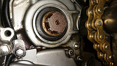 フロントスプロケットを取り外してカンターシャフト周辺を見て見ましたら、オーナー様が綺麗にしているのも助かり ほぼほぼこの部分のシャフトシールが逝っている模様。