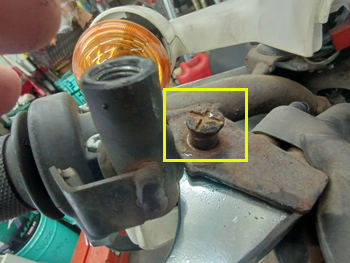 というのも このボルト自体がサビで半固着状態でして 写真は抜けてきた後のものなので 分りづらいですが 最初はボルトが締まっているので ボルト自体の頭もほぼフラットに近い関係とブラケット形状からしても バイスグリップ等が使えない状況だったのですよ。