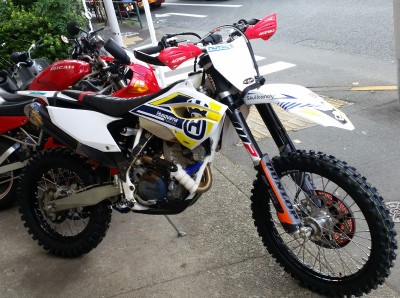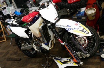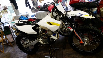 2年振りの8耐へ 全車皆兄弟 2021年09月16日 今週末はオフの『8耐』『第36回パワーエンデューロ8H』に 伊東二輪林道部 レギュラーメンバー共々 参戦してきます。 tetsuがエンデューロレースを本格的にやるハメになった 主因レースです。 それもこれも K主任のおかげですが(笑)。 今回も tetsuの ハスク FE号。ライダー tetsu・Sin・K主任 でのいつもの3人で組みます。 昨年 この3人で参戦予定でしたが中止となったので 今年の開催には皆 気合も入っております。 もう一組は全員 久しぶりのレース&初タッグの S部長・ヨシケン・渡 組み。 2チーム 6人出走です。 そんな自分のFEのレース用意を今週始め頃からお店終わったあとや開店前に作業していたわけでして。 基本的整備からタイヤ交換、オイル交換としてきてサイドカウルも新調に。 実は昨年の8耐前に割れ等でボロくなったシュラウドカバー左右をキレイにすべく その部分だけの部品、デカールは入手しておりました。しかし昨年は8耐が中止になったこともあり カウルもそのまま補修して使用延長しておりました。 やはり今回を機におめかししておかないと「いつ使うんだ!」ってなりそうだったので(笑)。 それにデカールの接着剤も劣化していって粘着力自体落ちてしまいますからね。 ということで 新調しても 今までと同じデカールなので 見栄えもキレイになっただけとも(笑)。 因みにフロント周りは主任の300XCWよりごっそり移植しているので一部オレンジ色が入っておりますがこれがまたアクセントでカッコイイです。 でもって シートカウル部分のデカールも貼り換えたので 全体的にリフレッシュされた感があって やはり気持ちいいですね! 今回は 各部のセッティングも今までより大きく変更したこともあり それが吉になってくれることを期待!(3人試走のインプレは別のバイクになった感じとも.....) これで準備万端 、今回も 最後まで宜しくたのんだぜ! FEくん!! ということで週末 18日・19日はレースの為 休業します!すみません!!