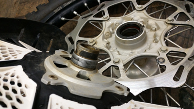フロントホイールのアクスルカラー部分もグリスアップ&スポーク点検。エンデューロレーサーはフロントタイヤはリヤタイヤに比べ かなり長寿命なので なにかないとフロントホイールすら外しません。そのため ホイールカラーの部分のグリスアップがおなざりになりがちになり そのため洗車やマディ走行等で水分がカラー内側に侵入しやすくなってしまいます。
