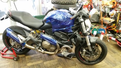 車検でお預かりだったドカのM821さん。ご近所さんで新車時よりずっと診させていただいております。二回目の車検ですが今回初のバッテリー交換依頼でした。