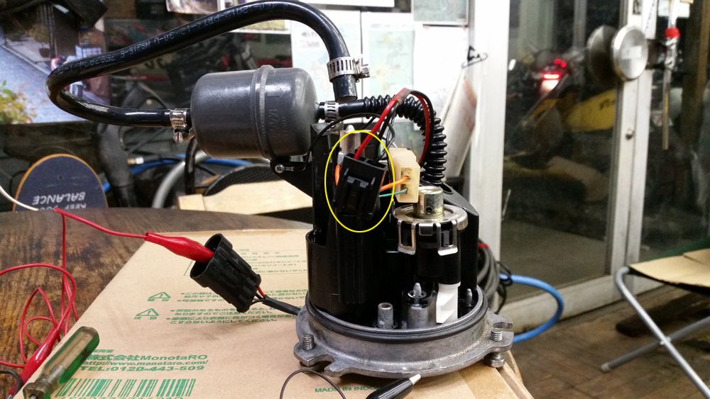 ということでタンク内から取り出した燃料ポンプユニット。916以降のドカSBKのタンク内には形状違えど こんなのが装着されてます。ひとまずユニット内の導通チェックしているとポンプの最終的につながるカプラ部で導通あったりなかったり???。試しに 999の方のポンプのみを取り出し お店のテスト用の方と交換してみてテストしたところ 「ウィーン」と回りました~~~(謎)。ポンプ不良ではない......かと?