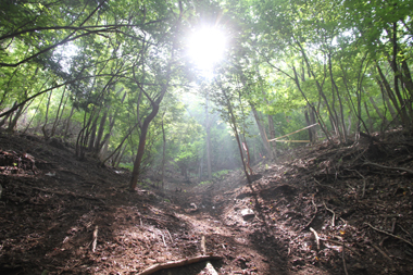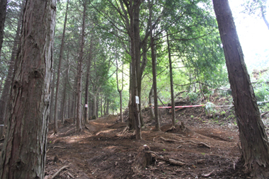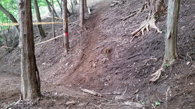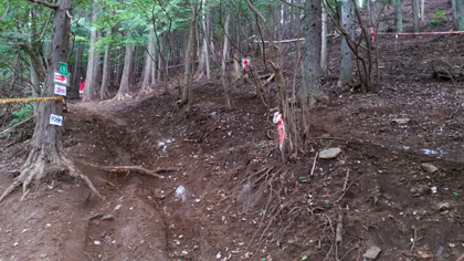 それを越えたすぐに今度は 最前半の肝としていた 「斜面に横たわる丸太越え」の箇所で 6台ほど あちらでもこちらでも バタついています。中には ライダー同士で助け合っているところも。ここは一番上まで登って行ったところに一台分のラインで 丸太をエスケープ出来る箇所が設けられてましたが そこまで行くラインもそれはそれで難しく 既にそこに向かう2台はどちらも後輪空転させながら押しが入っている状況(汗汗)。そこを待つラインでtetsuも待つハメになったのですが tetsuの前に他に2台、更に 後続の組も2組ほど追いついてきてしまいました。このままでは 各ラインが塞がってしまいそうだったので 止む無く他のラインへ変更することに。一番行きたくなかった 丸太越えラインを選ぶしかなく 3カ所ほど選べるなか 一番無難そうな 斜面下部に。
