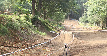 そしていざ 越えますと、フロントアップしたまでは良かったですが路面のグリップ力が期待したほどでなく(いや、乗り手がヘタッピだから)リヤが斜面に沿って流れてしまい バイクが傾いた状態で丸太越えになってしまう事に。結果 フロントがクリアできましたが リヤが弾かれて バイクが斜めのまま丸太上で転倒という事に(泣)。ただ この瞬間まで冷静だったが救いで 転ぶと分かった瞬間にバイクだけでも丸太の向こう側に行って欲しかったので バイクを丸太の向こう側に放り投げる感じになるように人間だけバイクから先に離れて落ちました。